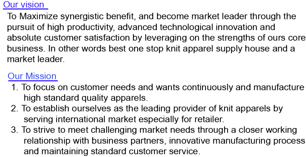 My company Employees are Most Experienced & qualified their professionals’ and very expert to ensure customer Satisfaction. Our Product Multi type Of Knit/Sweater /woven garments. Our ultimate goal is to satisfy our customers by providing quality, in time delivery & better service. Quality is our main strength. We see it from the view of customers.